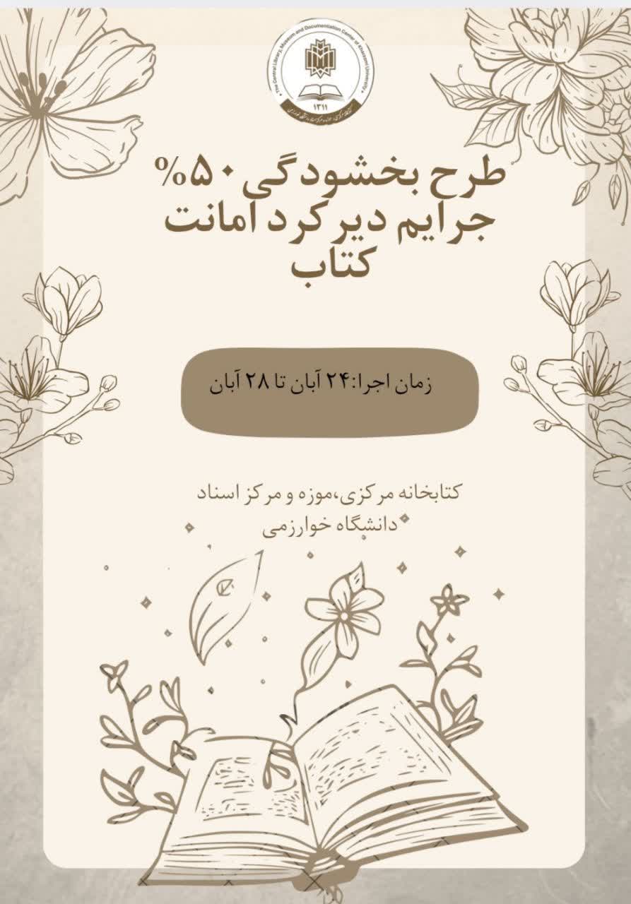 به اطلاع کلیه کاربران محترم کتابخانه می رساند؛ به مناسبت هفته کتاب و کتابخوانی و در راستای ترویج فرهنگ مطالعه و تسهیل استفاده مجدد اعضا از منابع کتابخانه، طرح بخشودگی جرایم دیر‌کرد امانت کتاب با تخفیف ۵۰ درصد اجرا می‌شود.