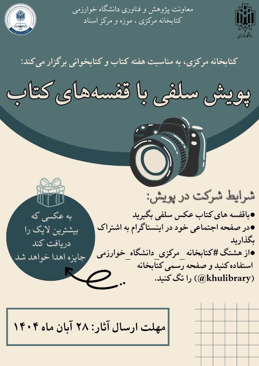 کتابخانه مرکزی دانشگاه خوارزمی به مناسبت سی و سومین هفته کتاب و‌ کتابخوانی پویش سلفی با قفسه‌های کتاب را برگزار می کند.