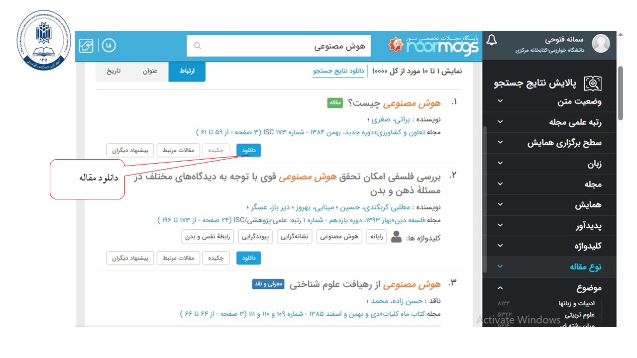 •امکان download مقالات دلخواه با فرمت تصویری pdf و متنی html